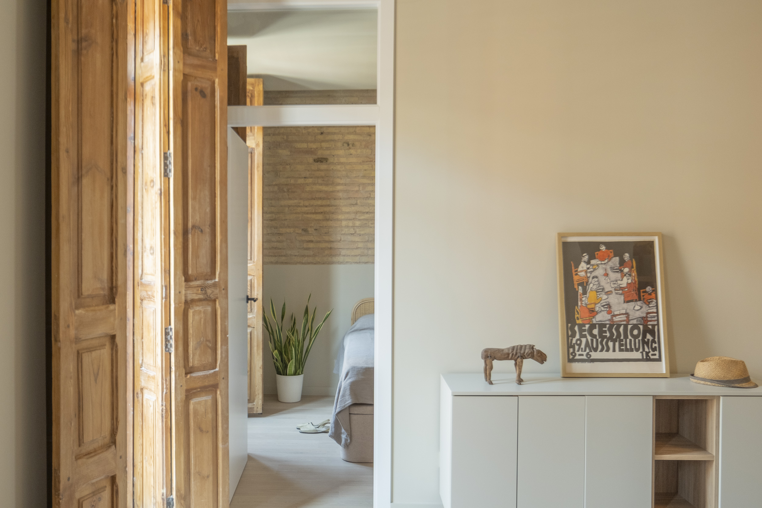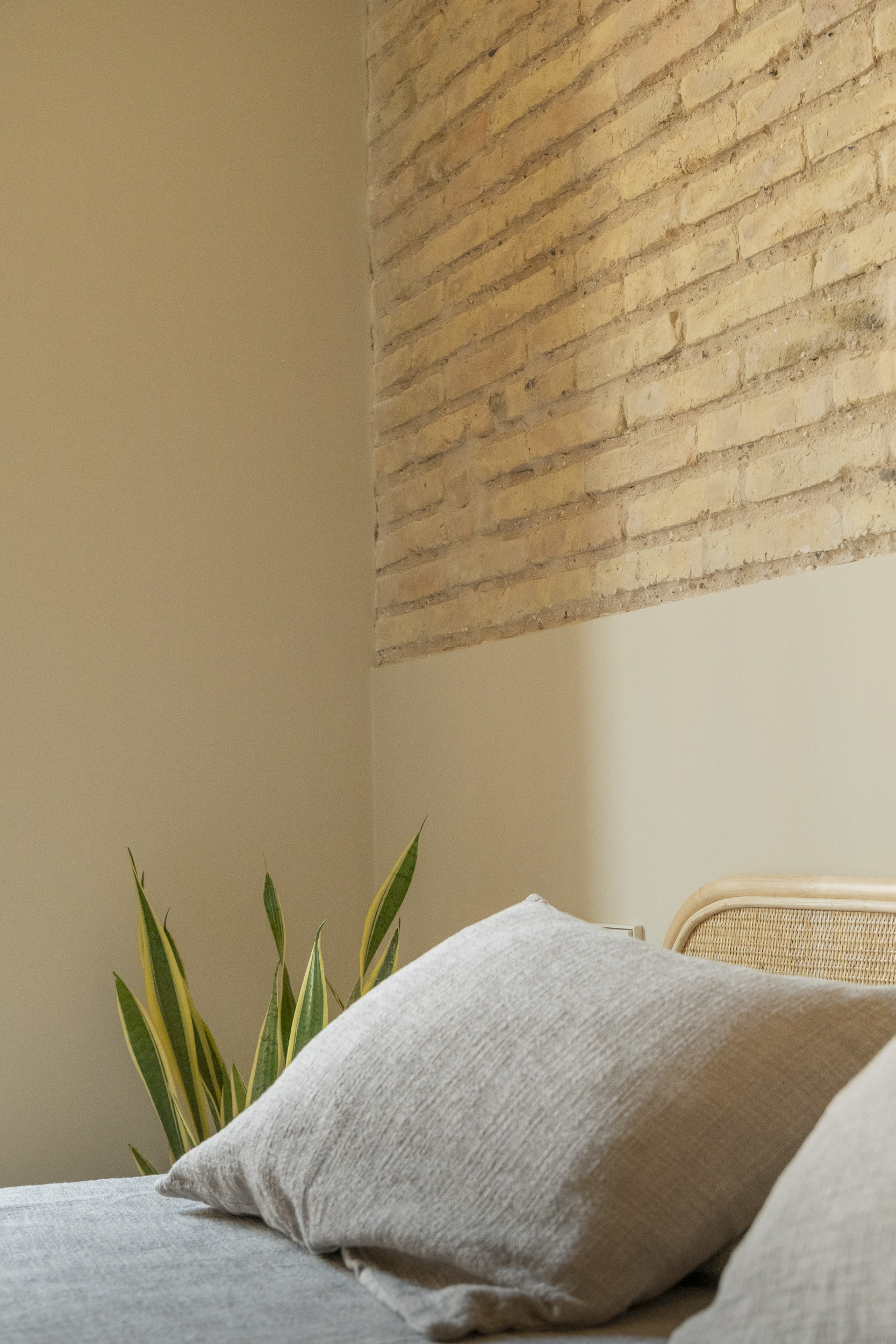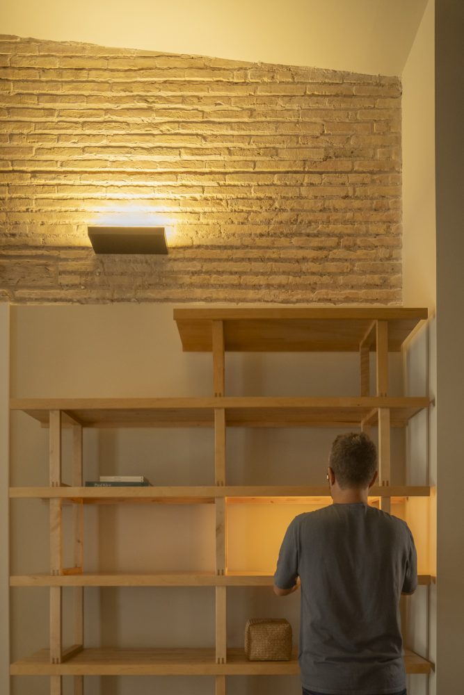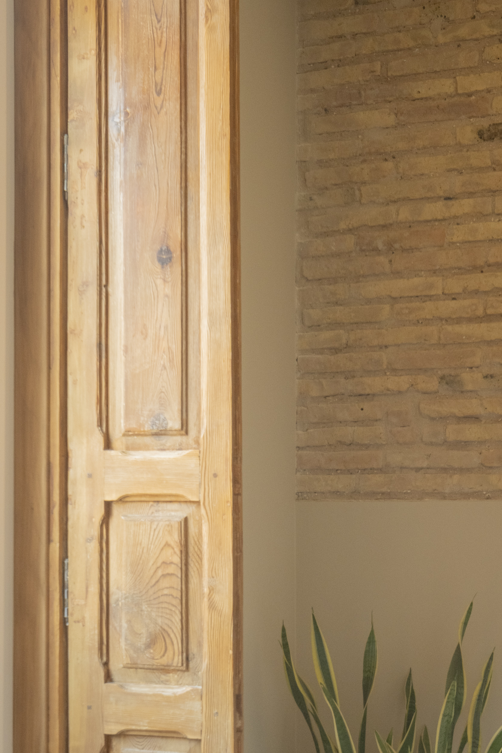 Como si fuéramos arqueólogos, vamos eliminando estratos hasta llegar al estado original, al año 0. Quitamos capas de pintura, quitamos falsos techos, tabiquería. Eliminamos elementos impropios dejando a la vista el ladrillo macizo, las vigas de madera.