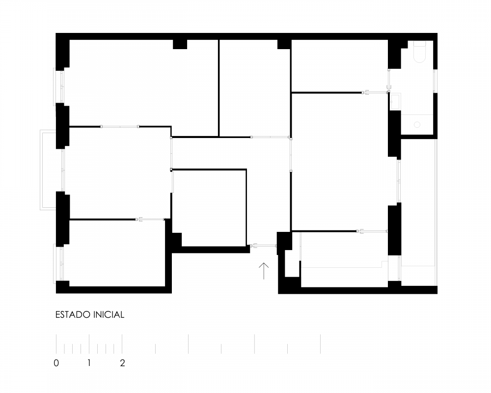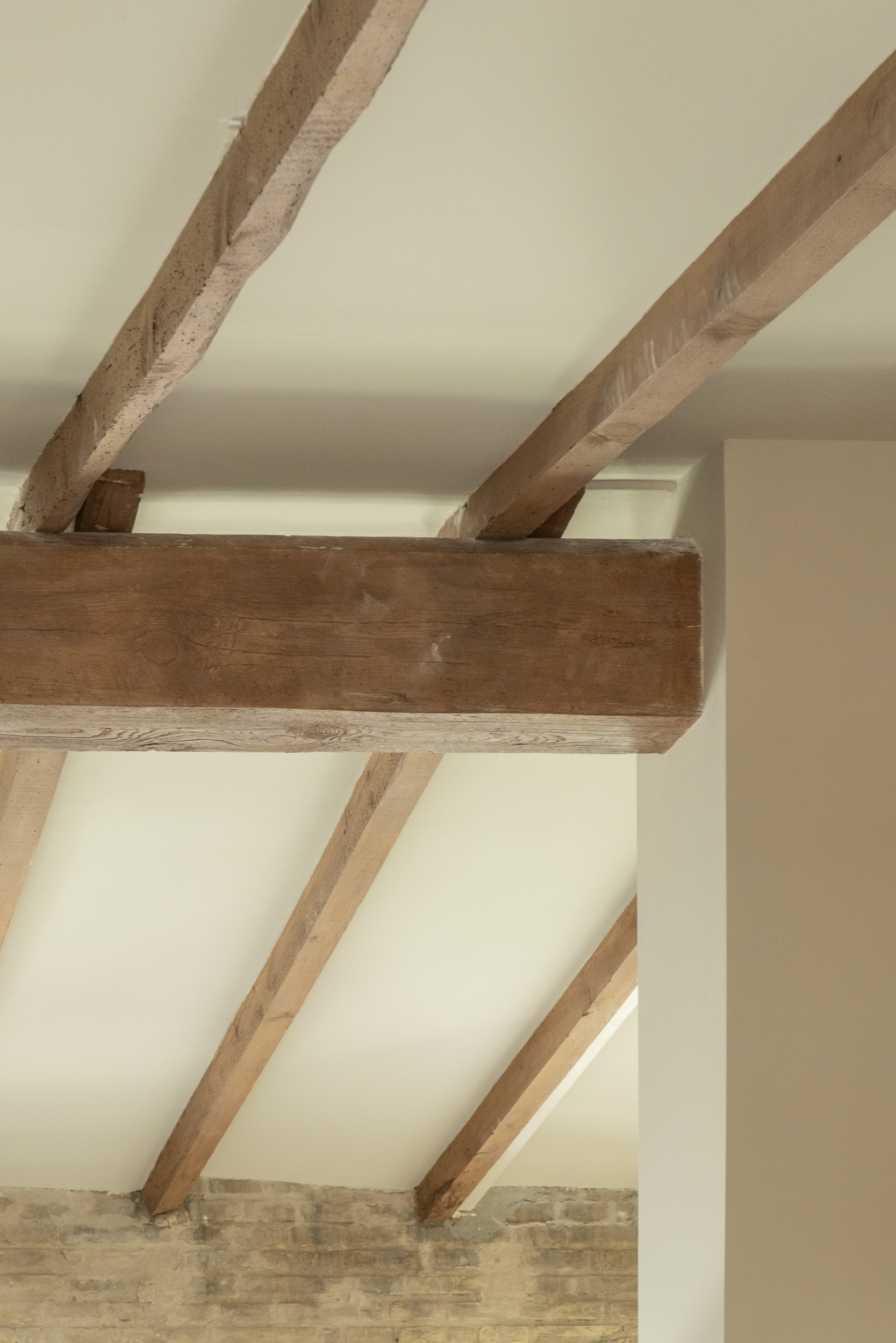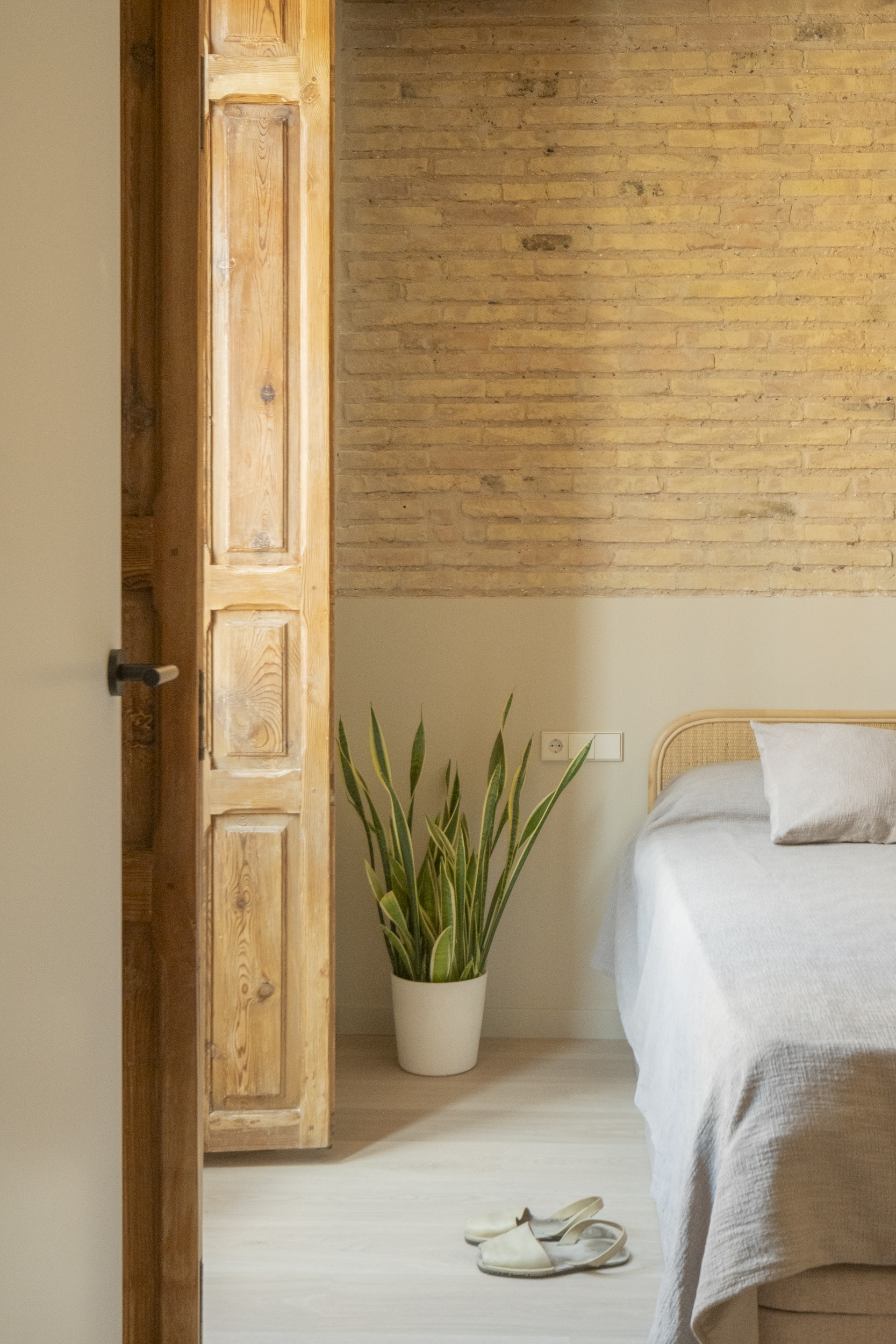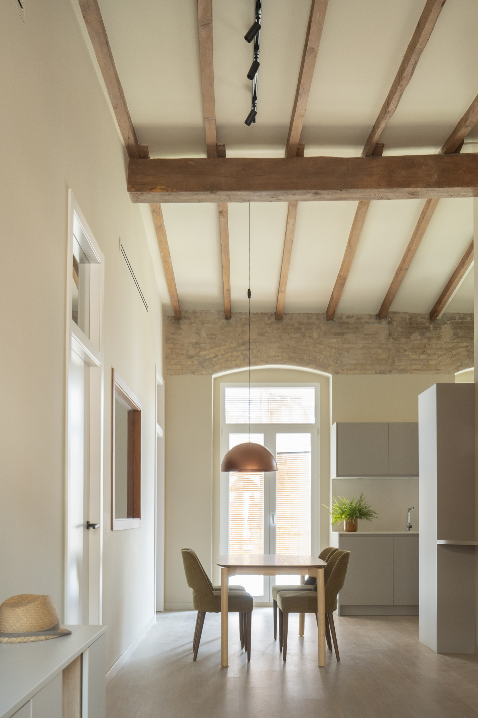 Como si fuéramos arqueólogos, vamos eliminando estratos hasta llegar al estado original, al año 0. Quitamos capas de pintura, quitamos falsos techos, tabiquería. Eliminamos elementos impropios dejando a la vista el ladrillo macizo, las vigas de madera.